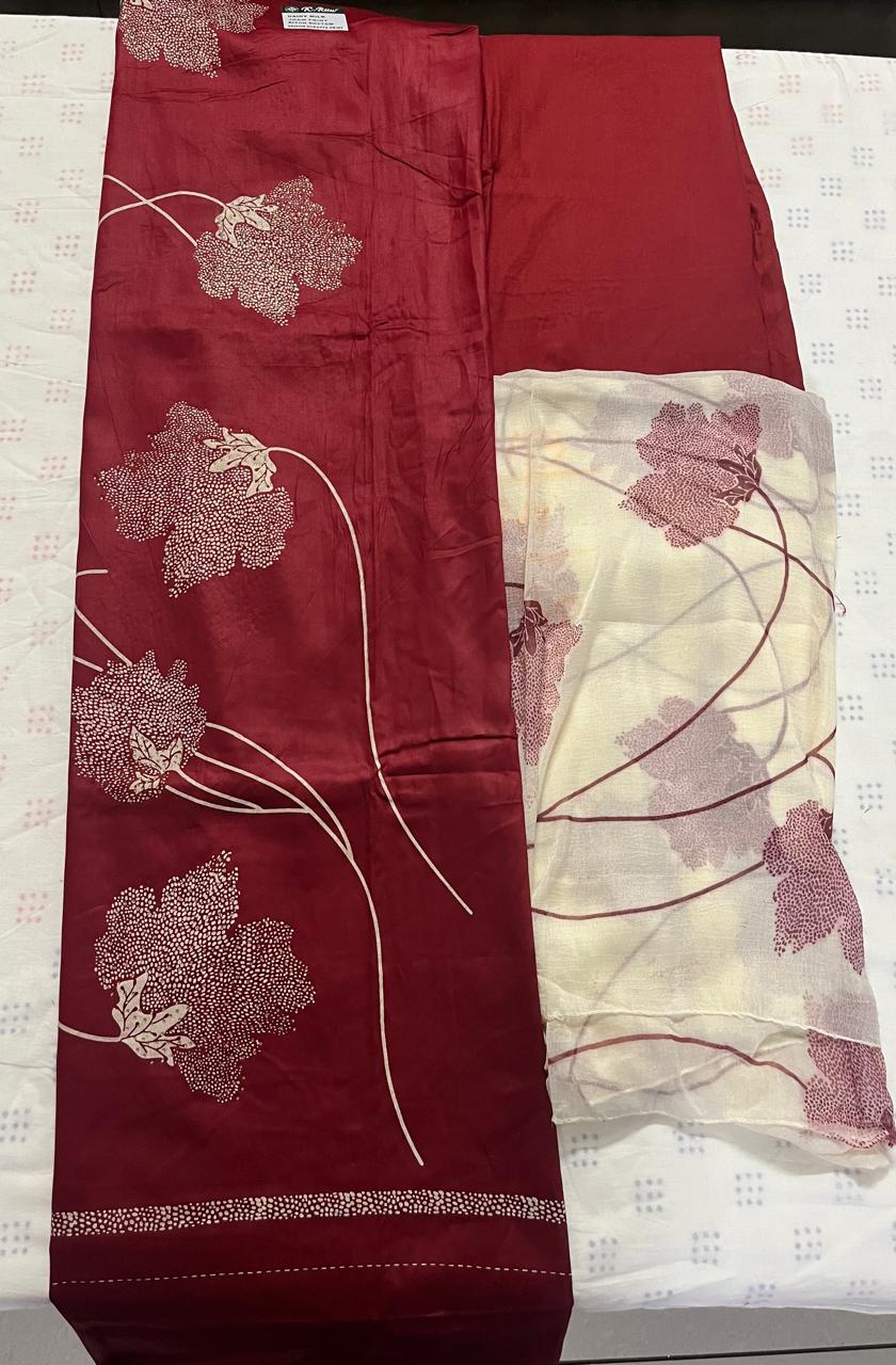 unstiched suit which is mehroon in colour with plain salwar and dupatta